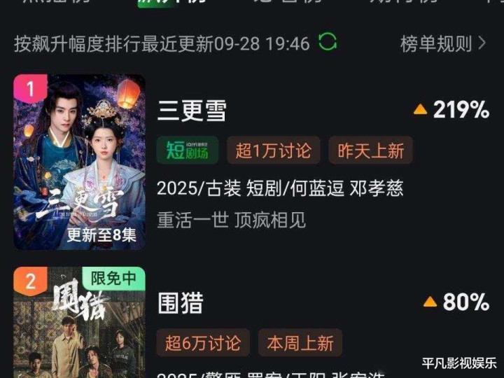 现在电视剧收视率越来越低,动不动就出三十集的注水剧,可短剧这边却越来越热闹,《山有九色念有卿》天天霸榜,《三更雪》开播第一天就冲上热搜,我表妹天天给我发消息说这剧太上头了,她以前从不追剧,现在居然熬夜追更。